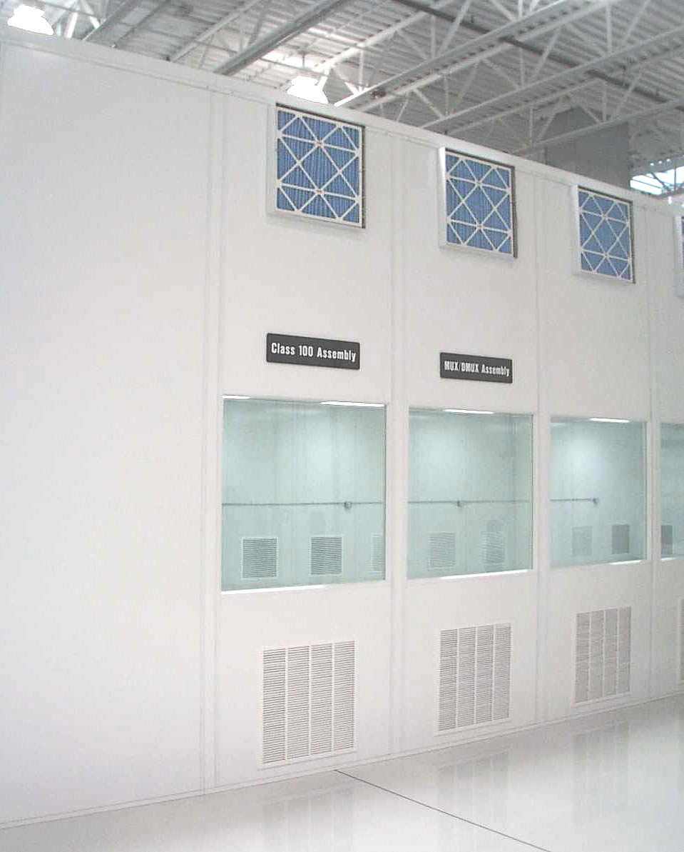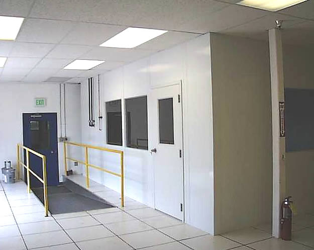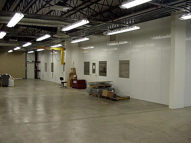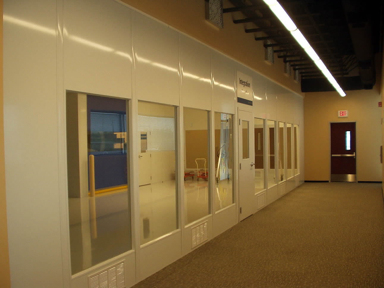 Prefabrication of wall panels, windows and entry ways enables the Hardwall cleanroom to be easily modified, expanded, or relocated. Our standard Hardwall panels are 3” thick, with a center core of polystyrene covered on both sides with white painted steel. Panels are attached to one another via a two-piece structural post design. This implementation allows for a non-progressive paneling system, which simply means, wall sections can be removed and/or replaced without disturbing the adjacent structure. The two-piece posts systems are used to conceal electrical wiring and cabling as well as housing structural inserts.