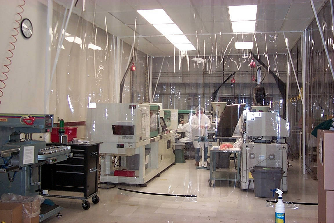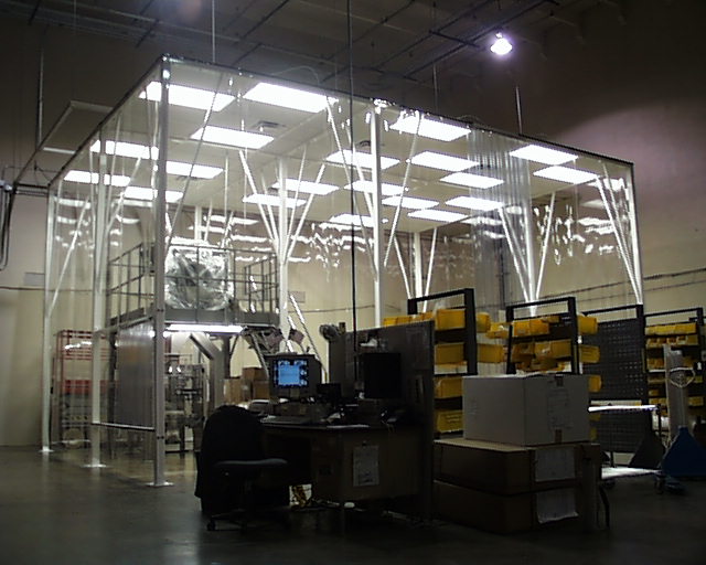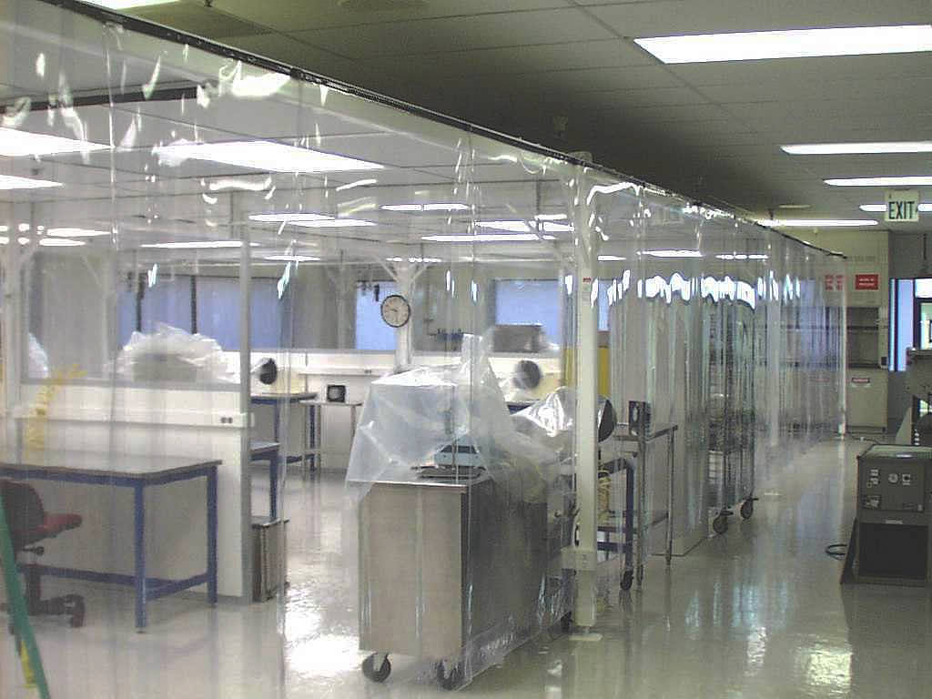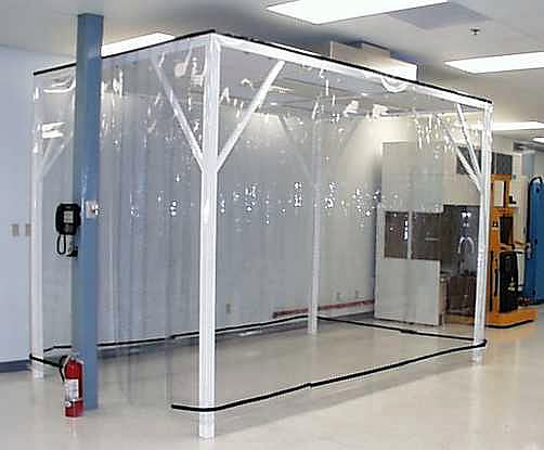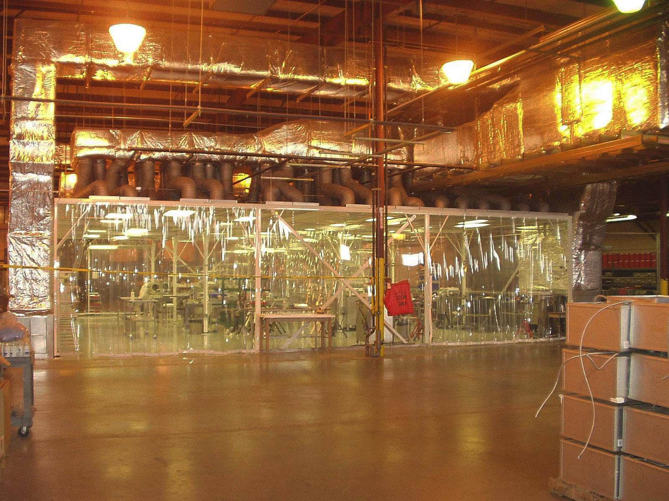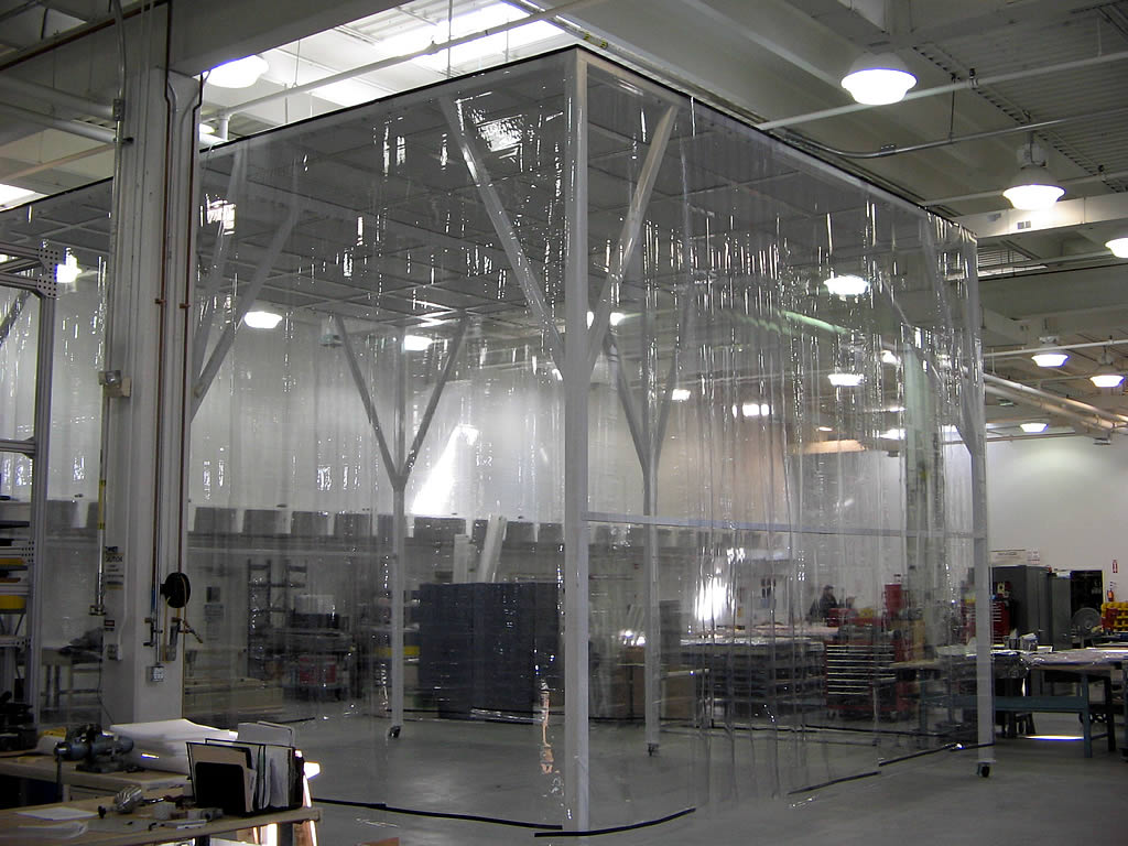 Standard vinyl wall panels are custom made to size utilizing 20mil clear, flexible vinyl and are attached to the frame with 3M Dual-Lock fasteners. In conjunction with our wall panels, we use a 40mil clear vinyl strip door (strip curtain) for easy access in or out. Additional panel materials such as anti-bacterial, static dissipative (ESD), low out-gassing UV Tinted and Opaque are also available.